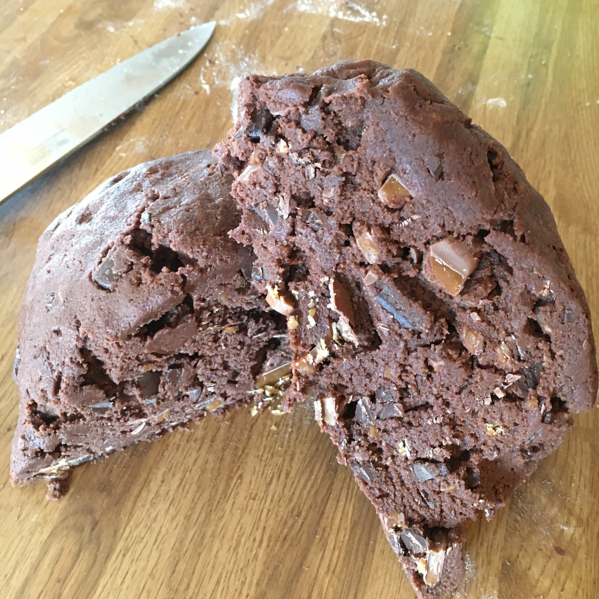 Tillsätt sedan 1 dl kakao, 5 dl vetemjöl, 2 tsk bakpulver, den hackade chokladen och den hackade Daimen. Tryck ihop degen tills allt är Ordentligt blandat. Är den kletig så bör du tillsätta 2-3 msk vetemjöl.